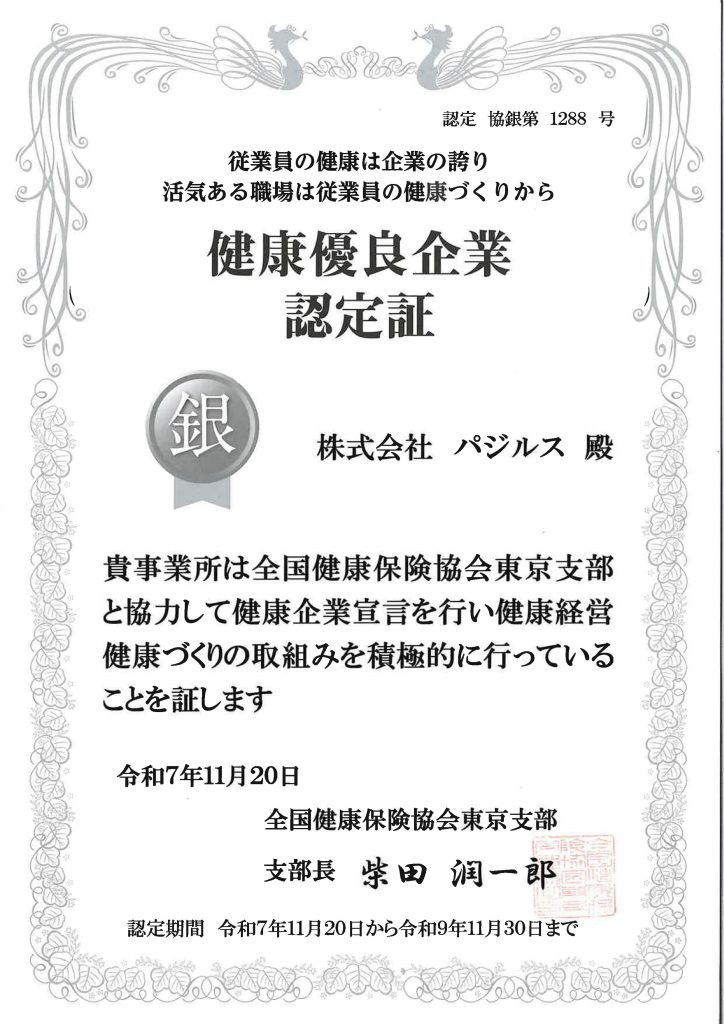 「健康優良企業 銀の認定証」をいただくことができました!